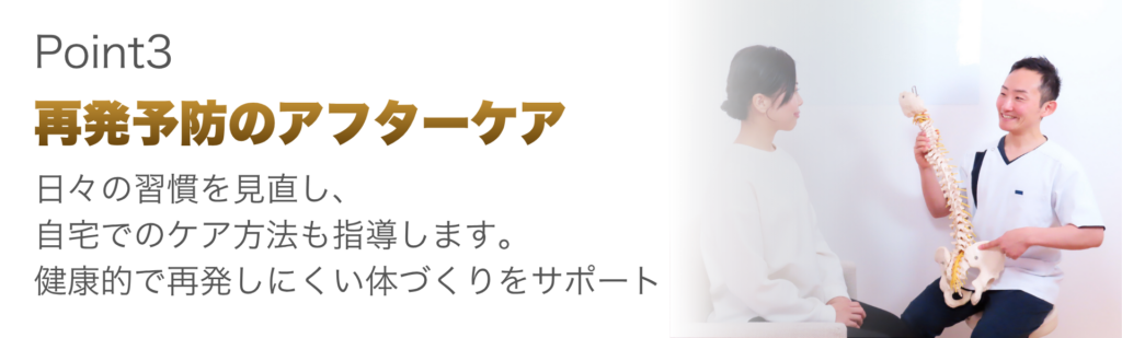 再発防止に向けて日常生活での体の使い方やセルフケア方法についてもアドバイスし、患者様が自分で健康を維持できるようサポートしています。