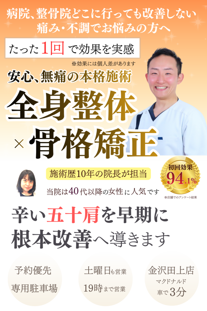 その名の通り40代で症状が出れば四十肩、50代で症状が出れば五十肩と呼ばれています。