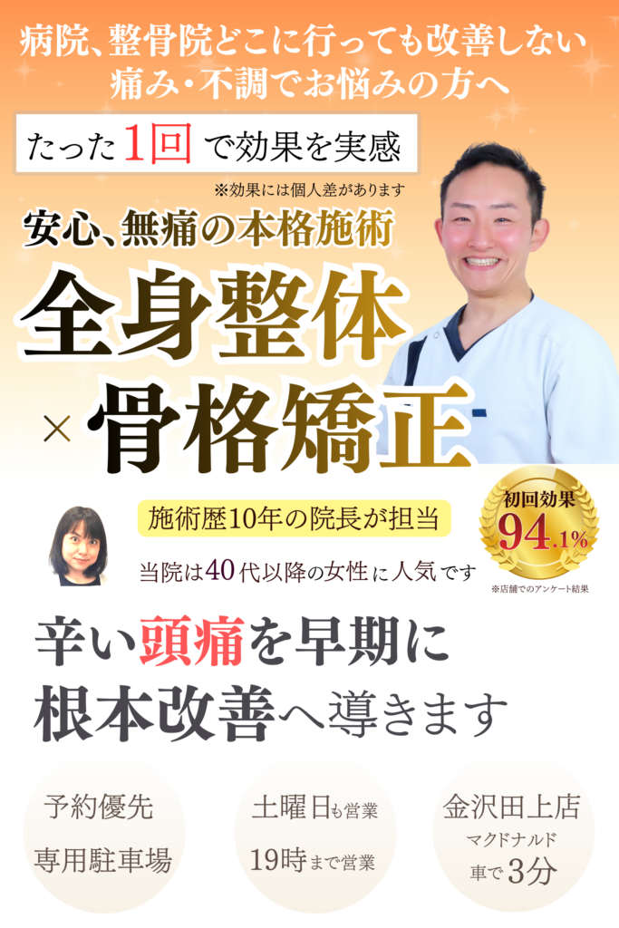 頭痛は、長期的な無理な姿勢、事務作業やパソコン作業などの同じ姿勢が続くことが原因と考えられます。